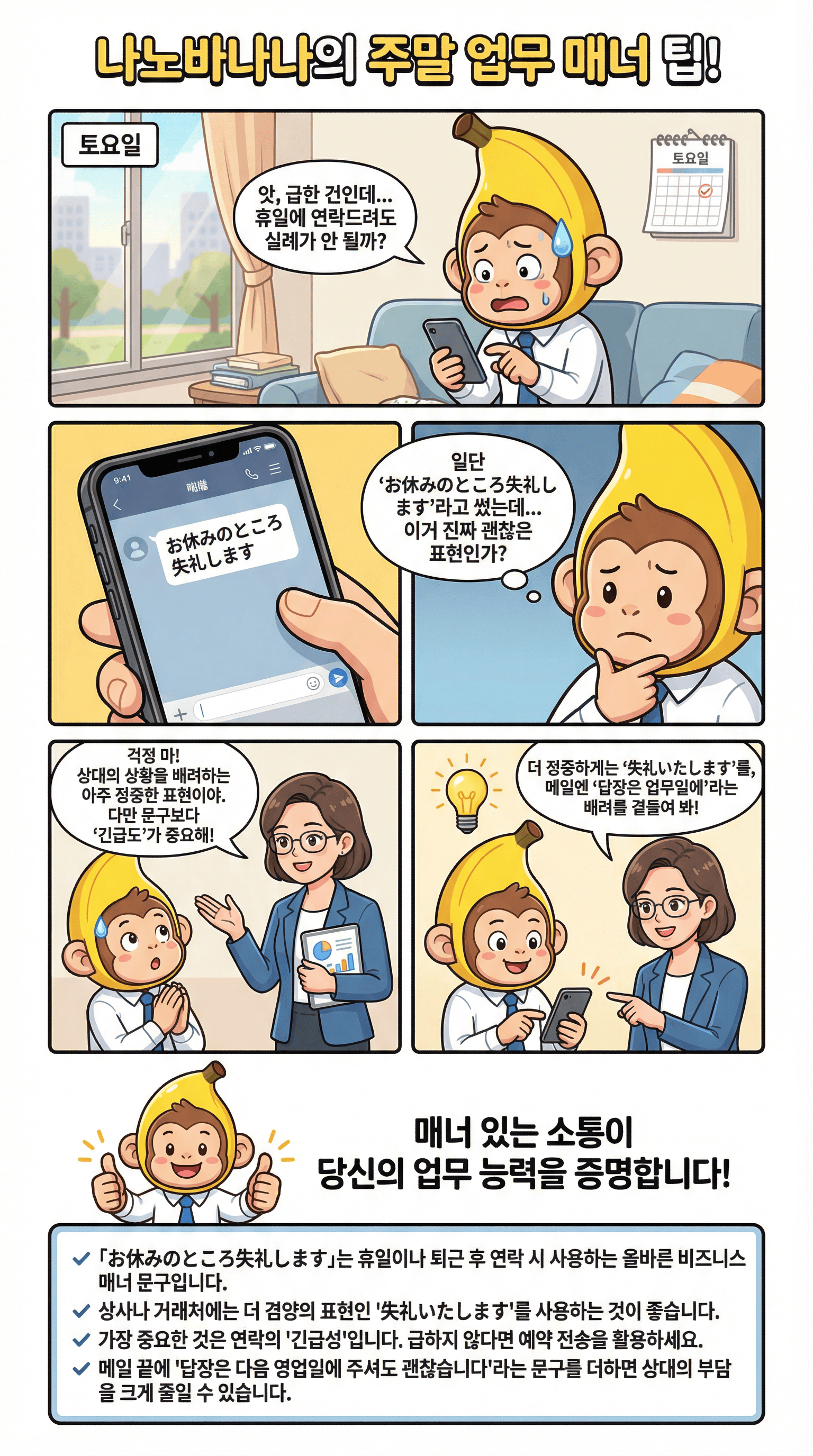 많은 학습자가 "이 문장만 쓰면 휴일에 연락해도 괜찮겠지?"라고 생각하지만, 사실은 문장 자체보다 연락하는 행위와 그 뒤에 붙는 배려가 더 중요합니다.