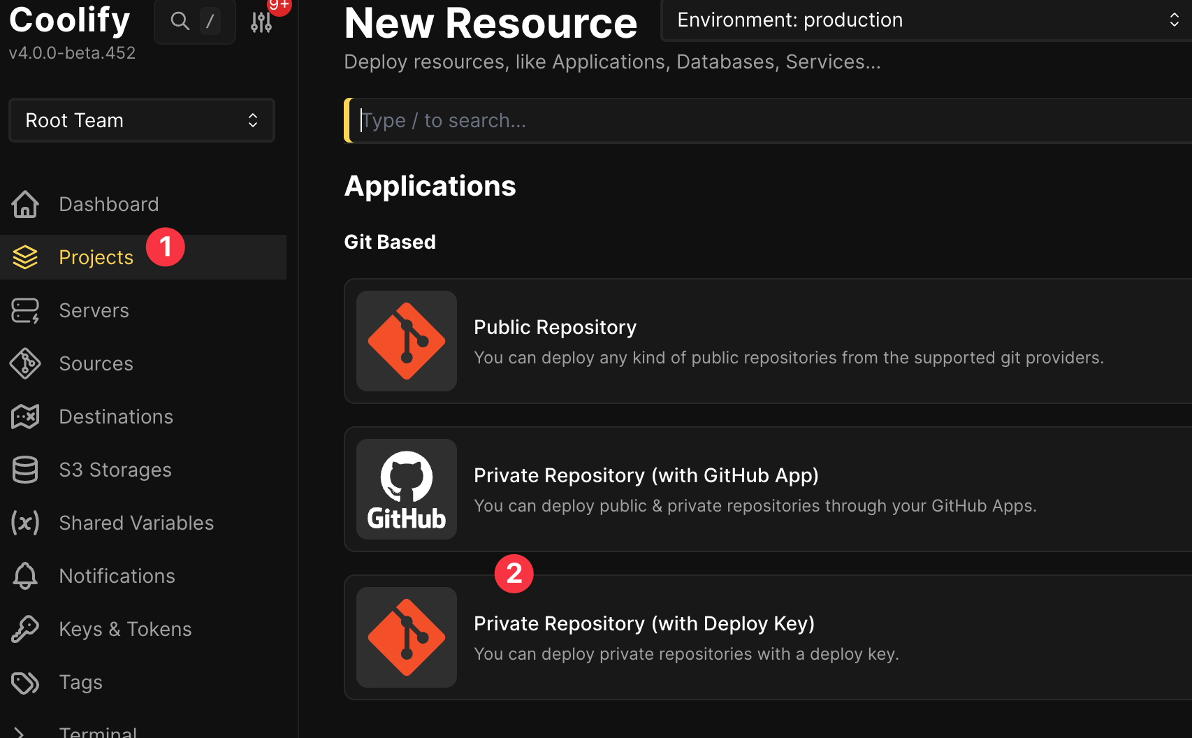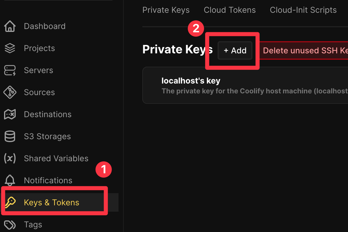 - Coolify 에서 key & Tokens 에서 ssh 용 키를 생성한다.