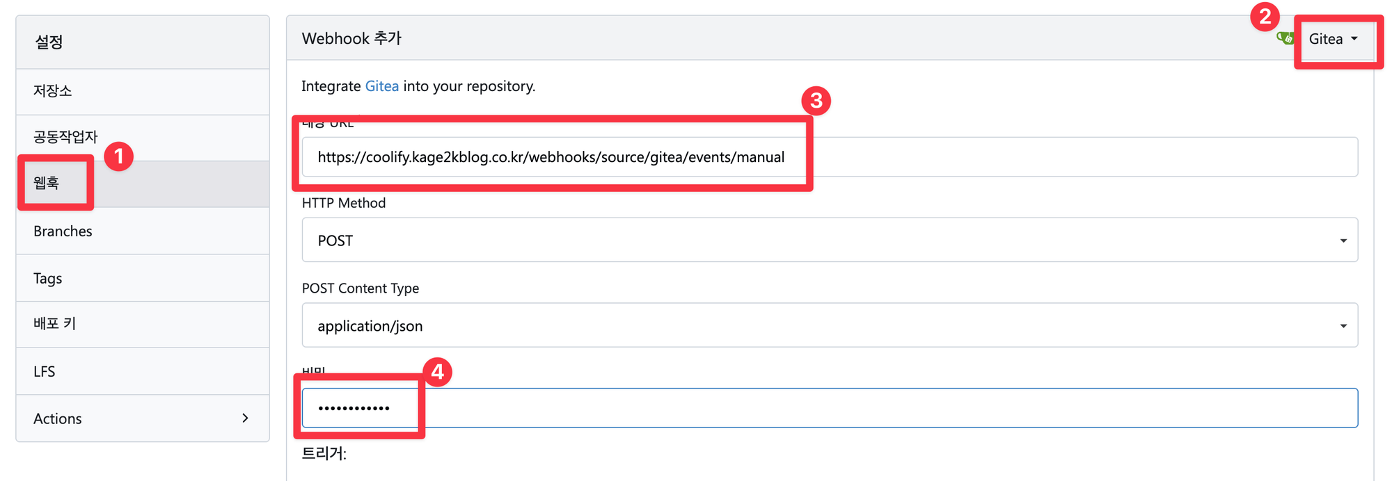 - gitea 프로젝트 설정으로 (메인설정이 아니다)