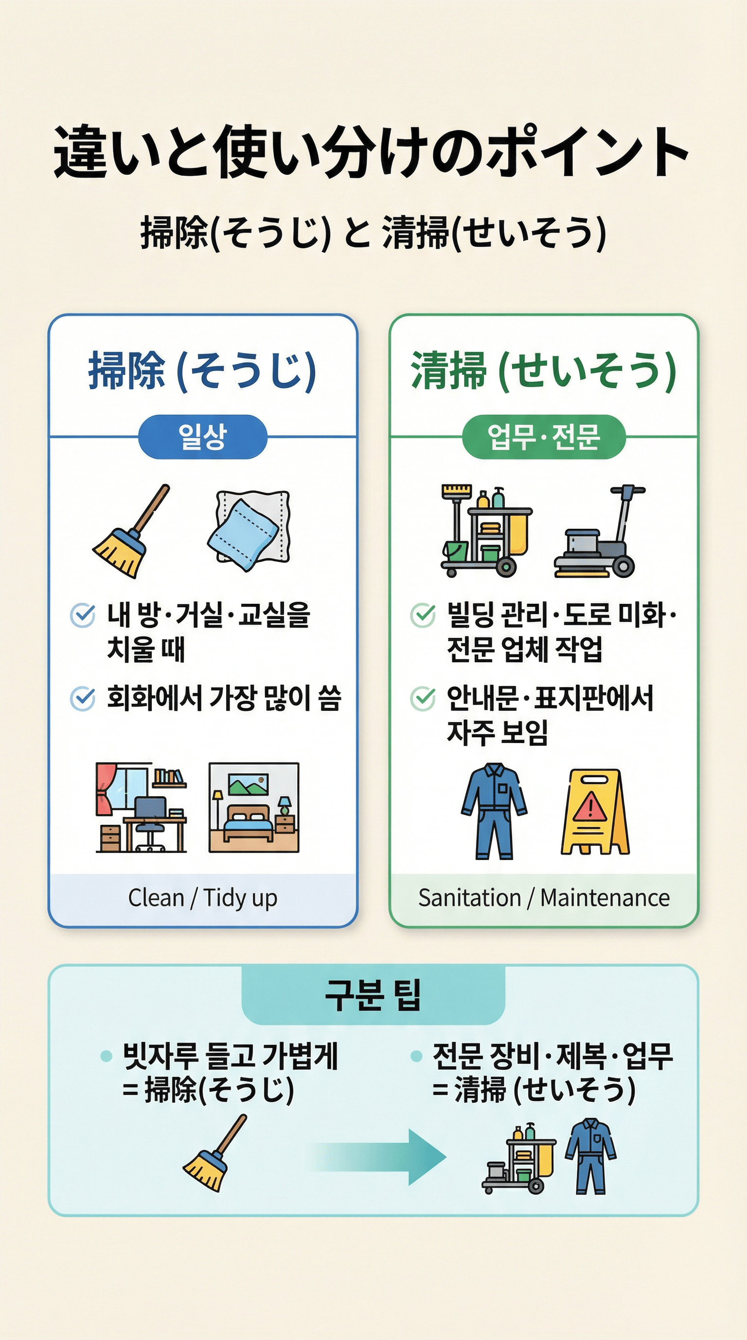 | 청소 (전문/공식) | 「清掃(せいそう)」 | 위생, 미화, 전문적 관리. (문어체, 안내문 중심) |