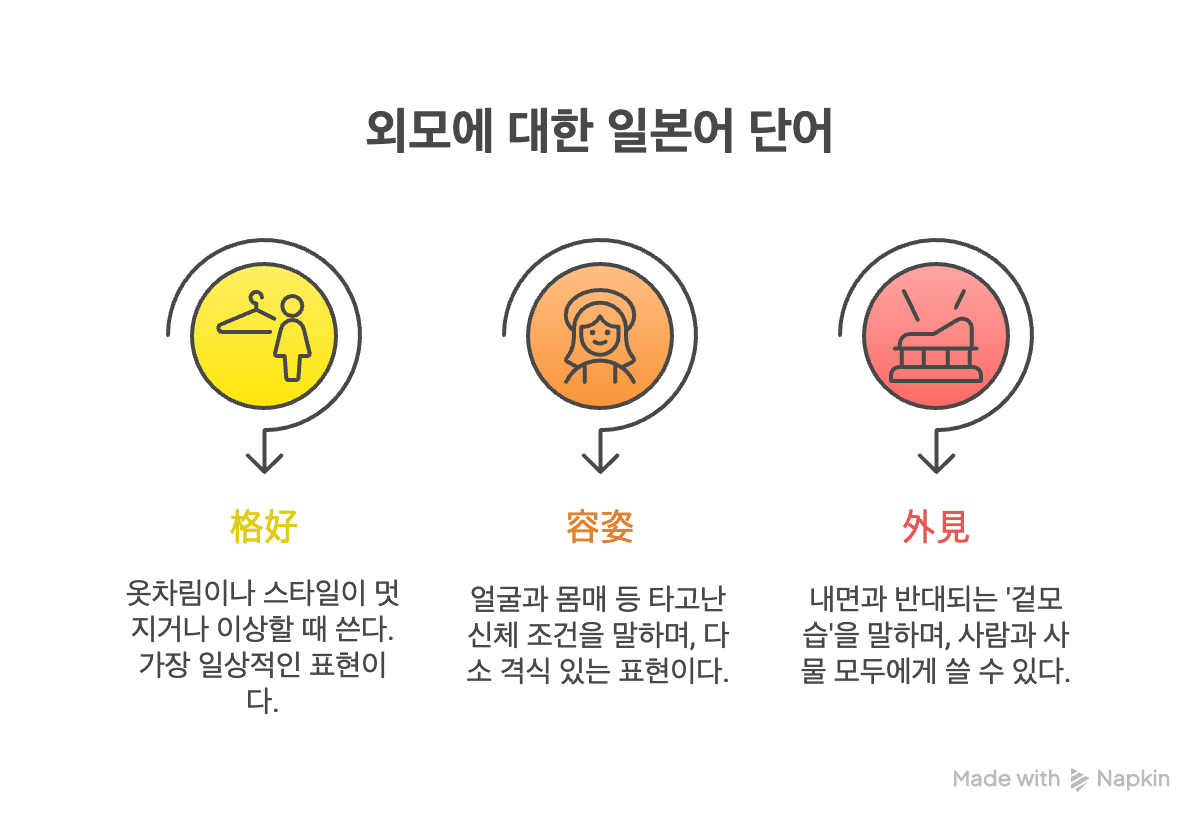 [일본어 뉘앙스] 格好, 容姿, 外見의 차이점 완벽 정리: '겉모습' 표현 마스터하기