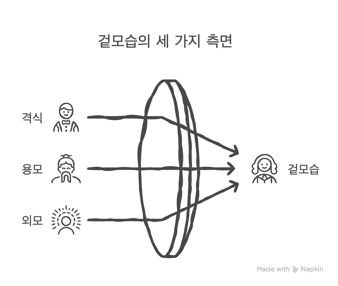 - 「外見(がいけん)」: '겉으로 드러나는 모습'이라는 가장 포괄적인 단어입니다. 주로 '내면'과 대비되는 개념으로 쓰입니다. 사람은 겉모습(外見)만으로 판단해서는 안 된다"는 표현처럼, 알맹이가 아닌 바깥쪽의 인상을 포괄적으로 나타냅니다