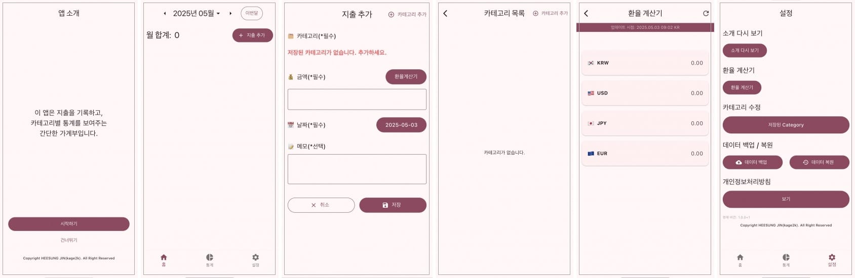 직관적인 입력, 로컬 데이터 저장, 통계 보기, 그리고 별도 메뉴로 제공되는 환율 계산기까지.