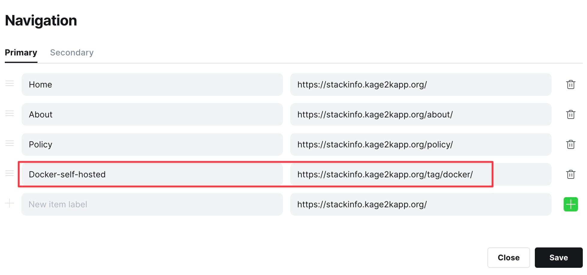 By kage2k in ghost_blog — Oct 12, 2024 Ghost blog -tag별 분류 링크 만들기 이래저래 티스토리에서 이전하려하는데 좀처럼 불편한 점이 많이 보인다. 이번엔 tag별 분류 링크를 만드는 법을 남겨본다. 도메인/ghost/#/settings/navigation/editnavigation 정의 하는 곳에 도메인/tag/태그이름 적용하고 상태