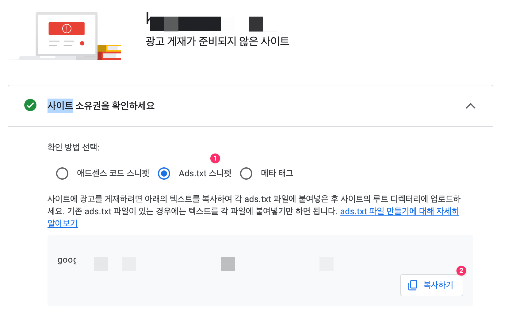 복사하기를 하고 메모장등을 열어서 해당 내용을 붙여넣기 한뒤에 파일명을 ads.txt 로 저장합니다.