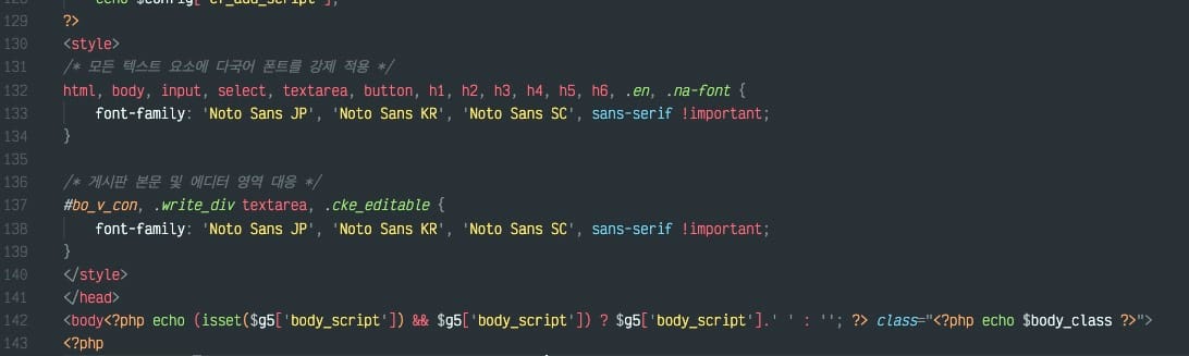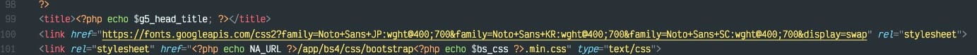 <link href="https://fonts.googleapis.com/css2?family=Noto+Sans+JP:wght@400;700&family=Noto+Sans+KR:wght@400;700&family=Noto+Sans+SC:wght@400;700&display=swap" rel="stylesheet">- 밑에서 </head> 태그가 닫히기 바로 윗줄에 아래의 코드를 입력한다.