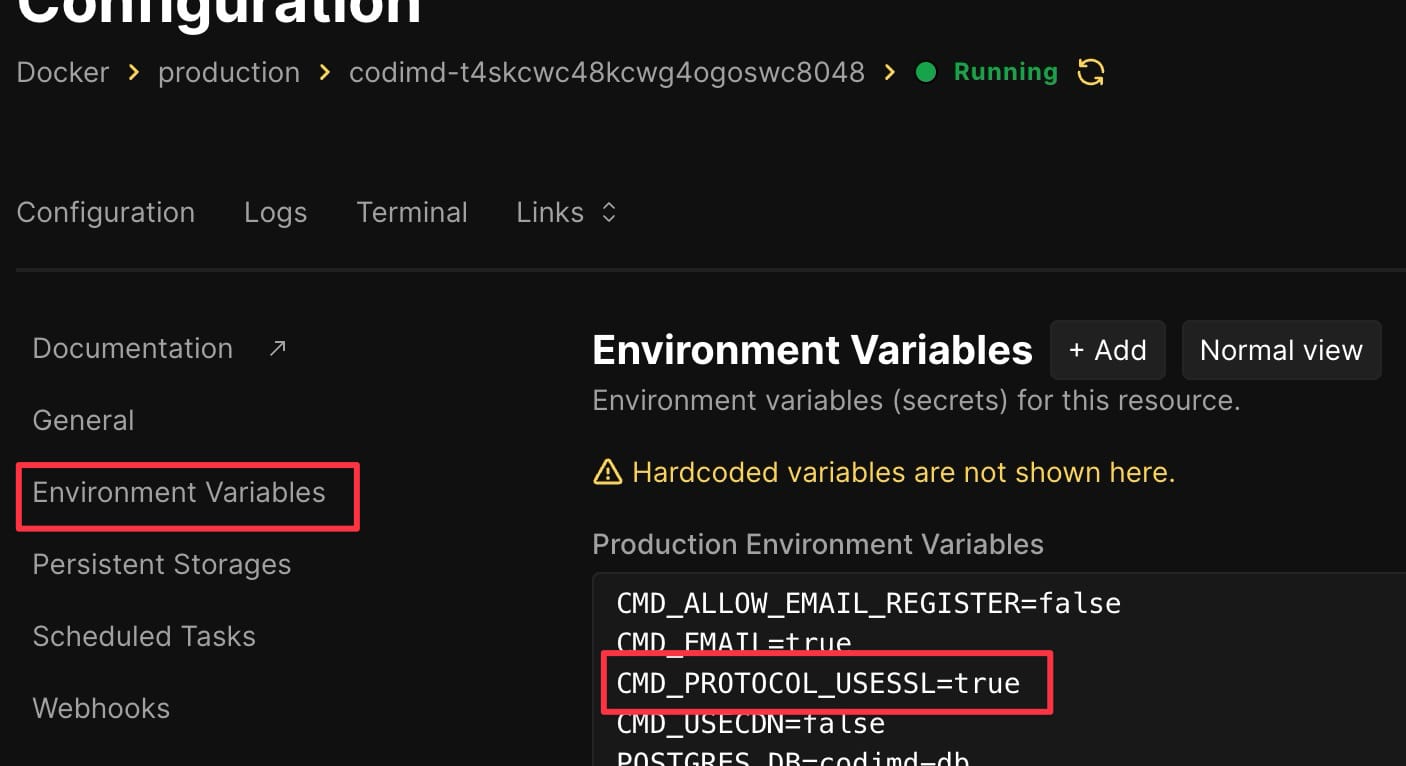 - Coolify 해당 서비스의 Environment Variables (환경변수) 설정 메뉴로 진입.