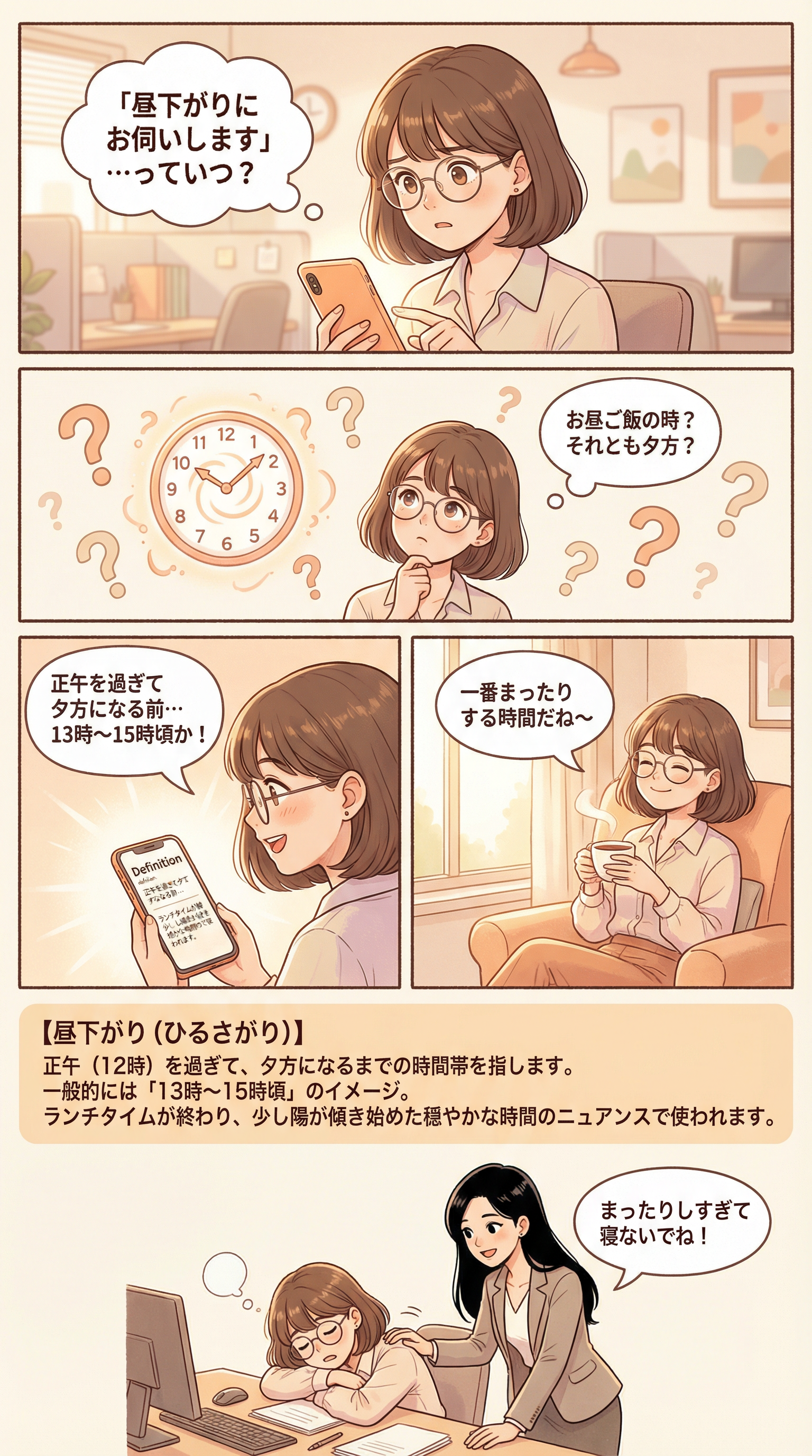 "일본어 '히루사가리(昼下がり)'가 가리키는 구체적인 시간대(오후 2시~4시 경)와 단어가 가진 특유의 평화로운 뉘앙스를 설명하고, 실생활 예문을 통해 올바른 사용법을 소개합니다."