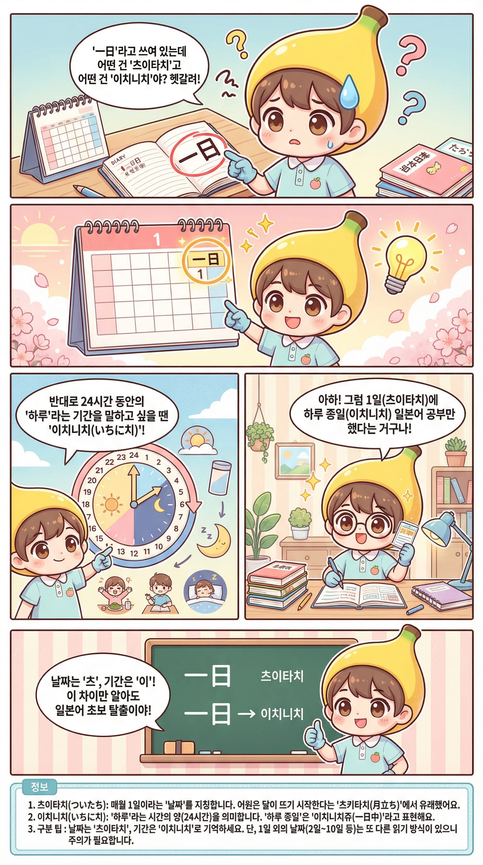 이제 「一日」라는 한자를 만나도 문맥에 따라 자신 있게 「ついたち」와 「いちにち」를 구분하여 사용하실 수 있을 겁니다.