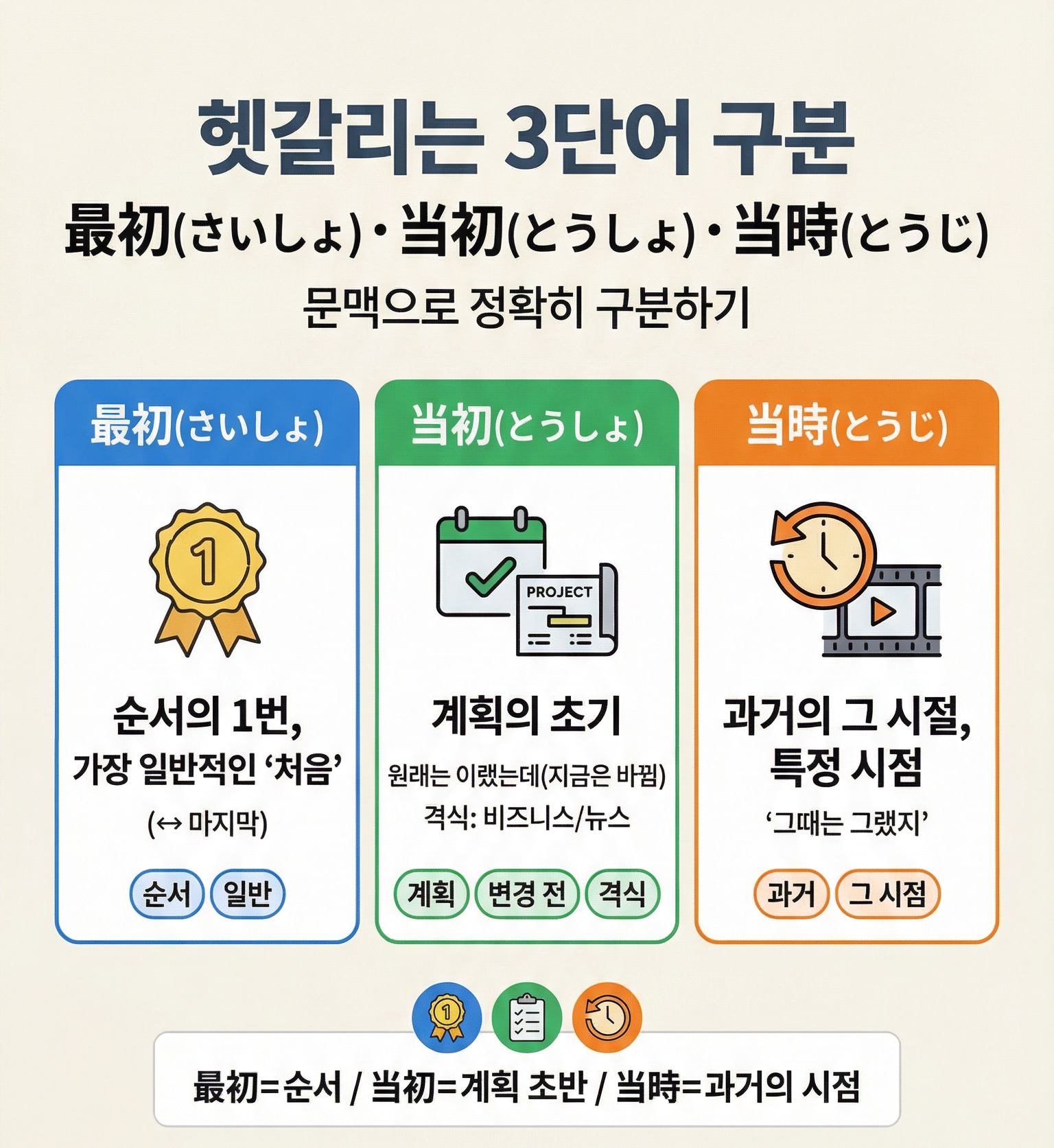 특히 비즈니스 일본어나 뉴스에서 자주 등장하는 「当初(とうしょ)」와 「当時(とうじ)」, 그리고 가장 기초적인 「最初(さいしょ)」. 이 세 단어의 결정적인 차이와 올바른 사용법을 완벽하게 정리해 드립니다.