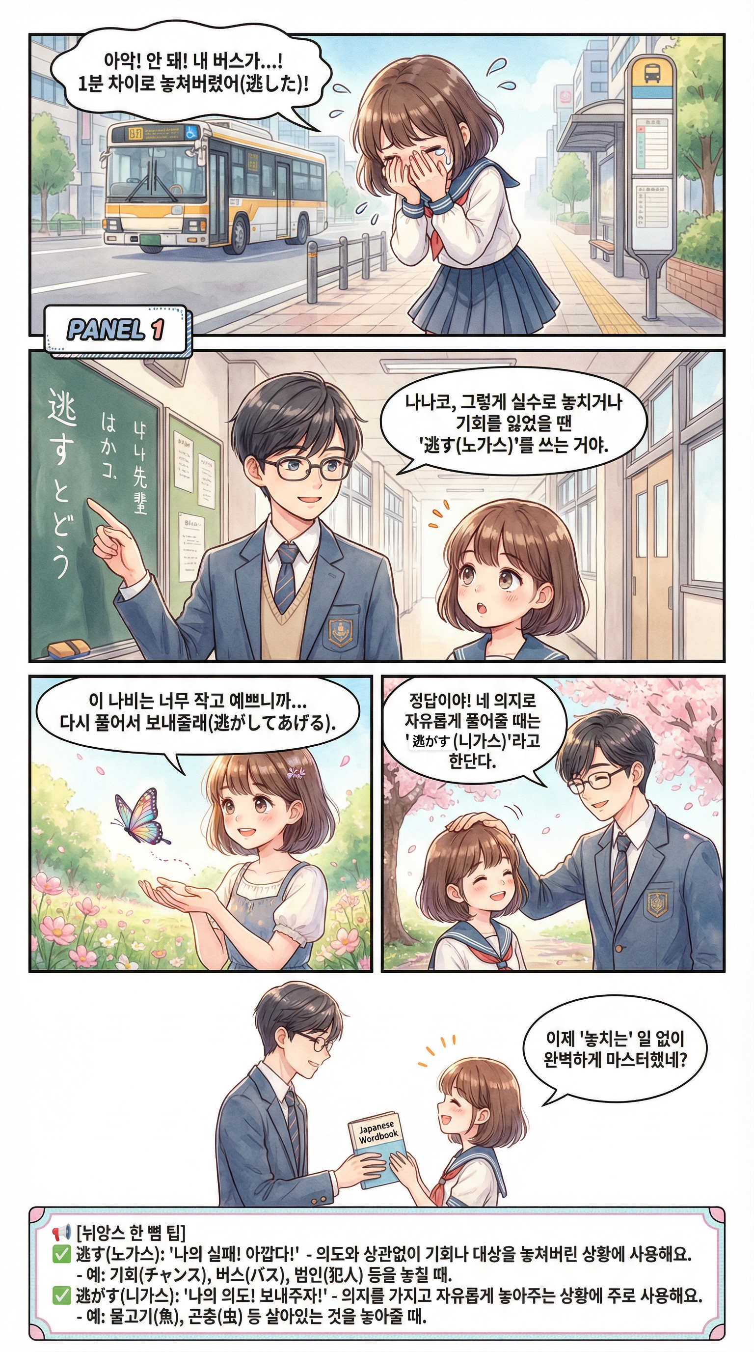 "기회를 놓쳤을 때는 '逃す(노가스)', 잡았던 물고기를 놓아줄 때는 '逃がす(니가스)'. 비슷해 보이지만 대상에 따라 확연히 갈리는 두 동사의 뉘앙스 차이와 실전 예문을 정리해 드립니다."