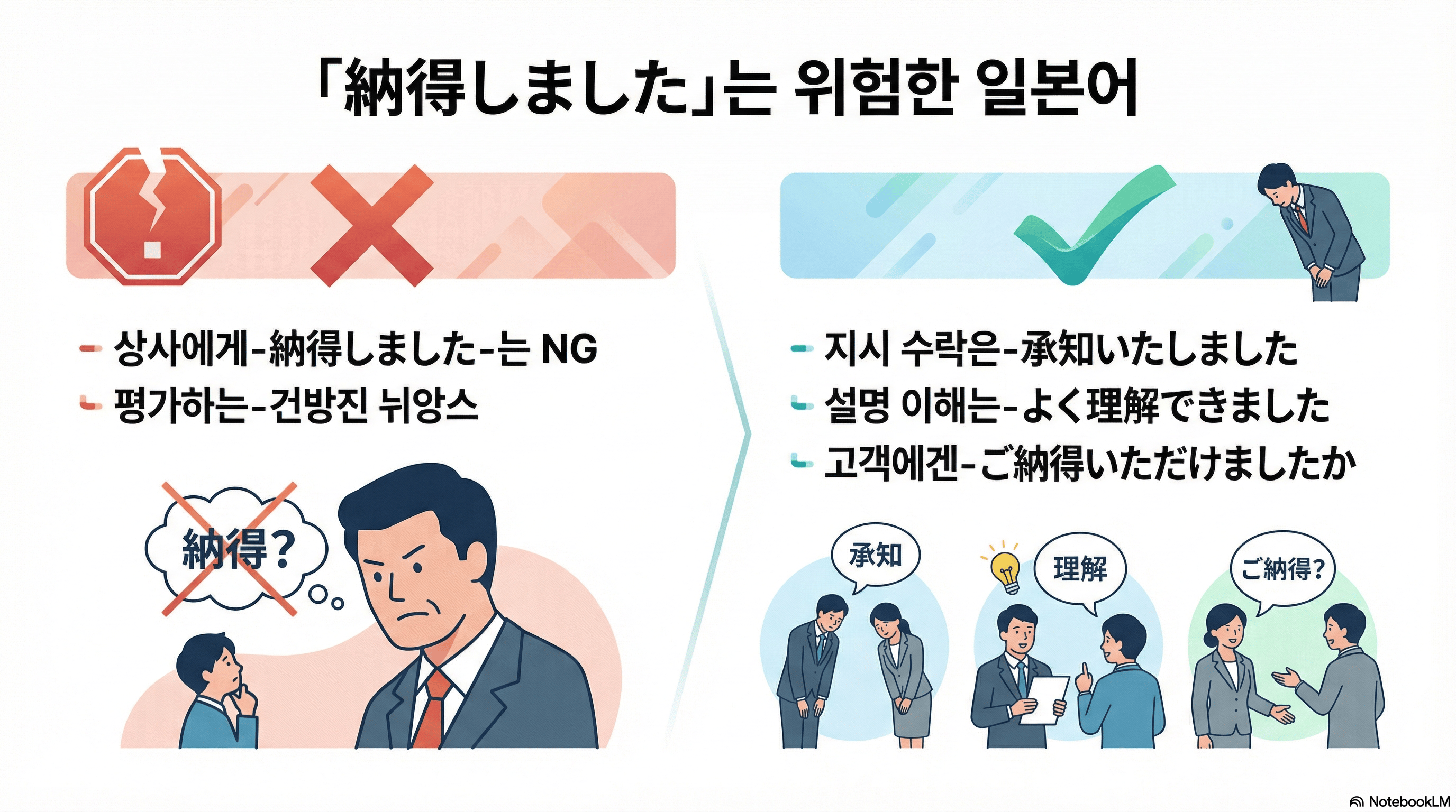 한국어의 '납득'과 의미는 같지만, 일본어 비즈니스 화법에서는 '누가 누구에게 쓰는가'가 매우 중요합니다.