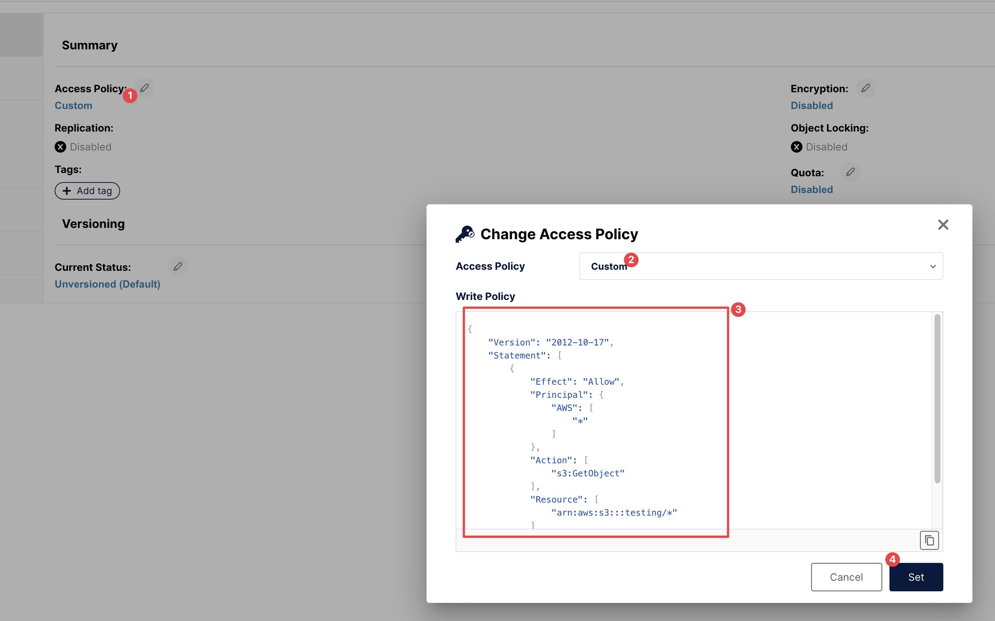 Bucket를 만들고 Access Policy 부분에서 권한 부분을 설정하지 않으면, dropzone에서 파일을 업로드 되는데 실제 파일을 read할 수 없게 되는 경우가 발생합니다. 따라서 권한 부분을 readonly 부분을 아래와 같이 설정합니다.
