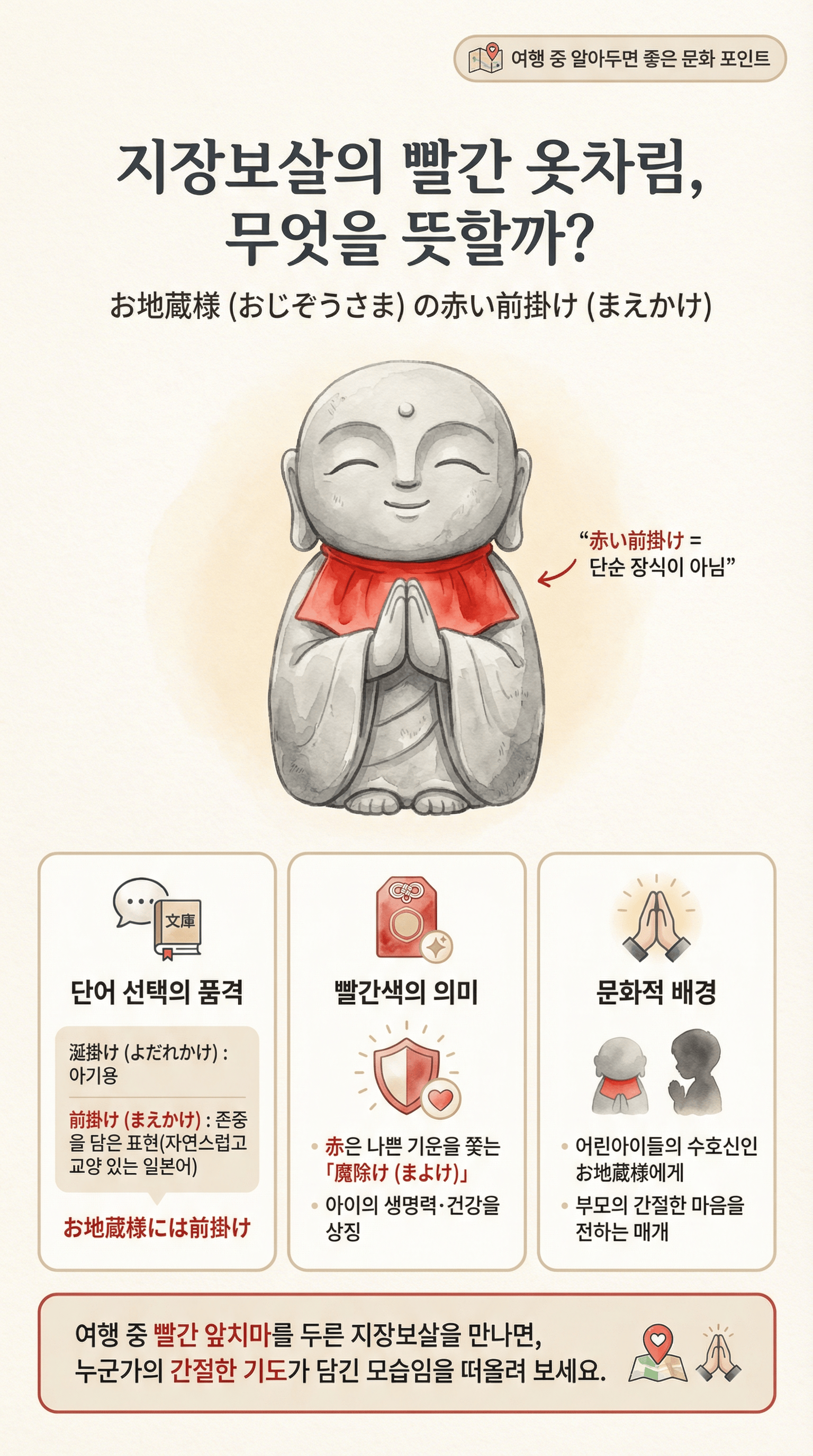 지장보살은 왜 하필 '빨간색'을 입고 있을까요? 슬프지만 따뜻한 일본 문화 배경과 前掛け, 涎掛け, 頭巾의 미묘한 뉘앙스 차이를 N1-N2 레벨에서 깊이 있게 파헤칩니다.