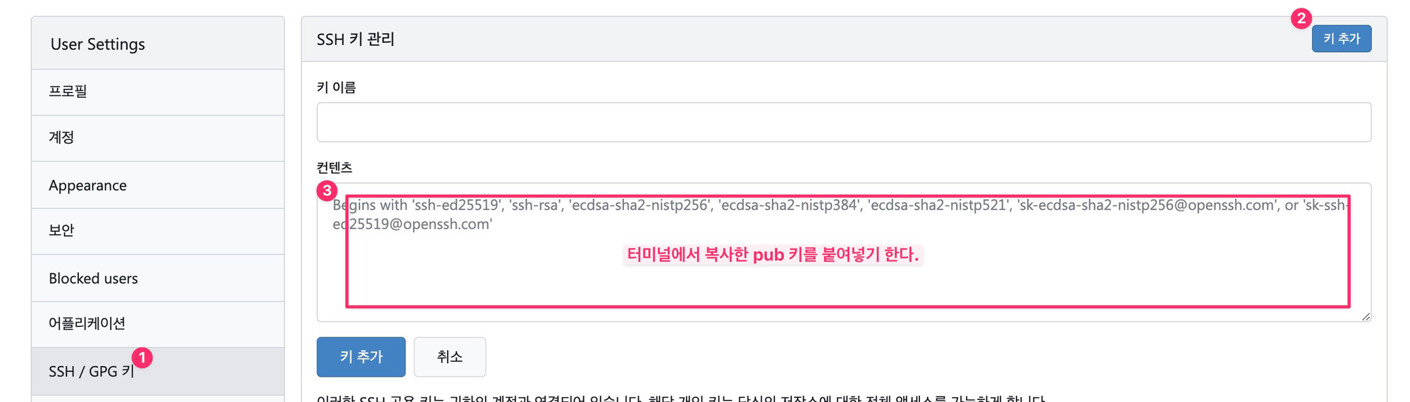 터미널에서 $ pbcopy < ~/.ssh/gitea10.pub 키를 클립보드에 복사한다.