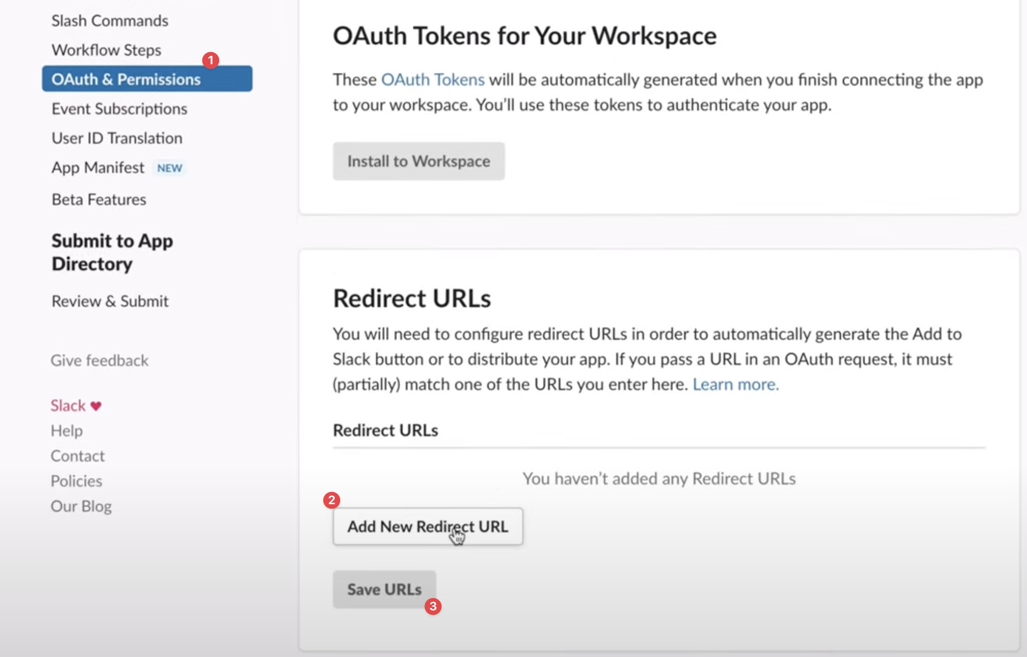 OAuth & Permissions탭 이동.- Redirect URLs에
