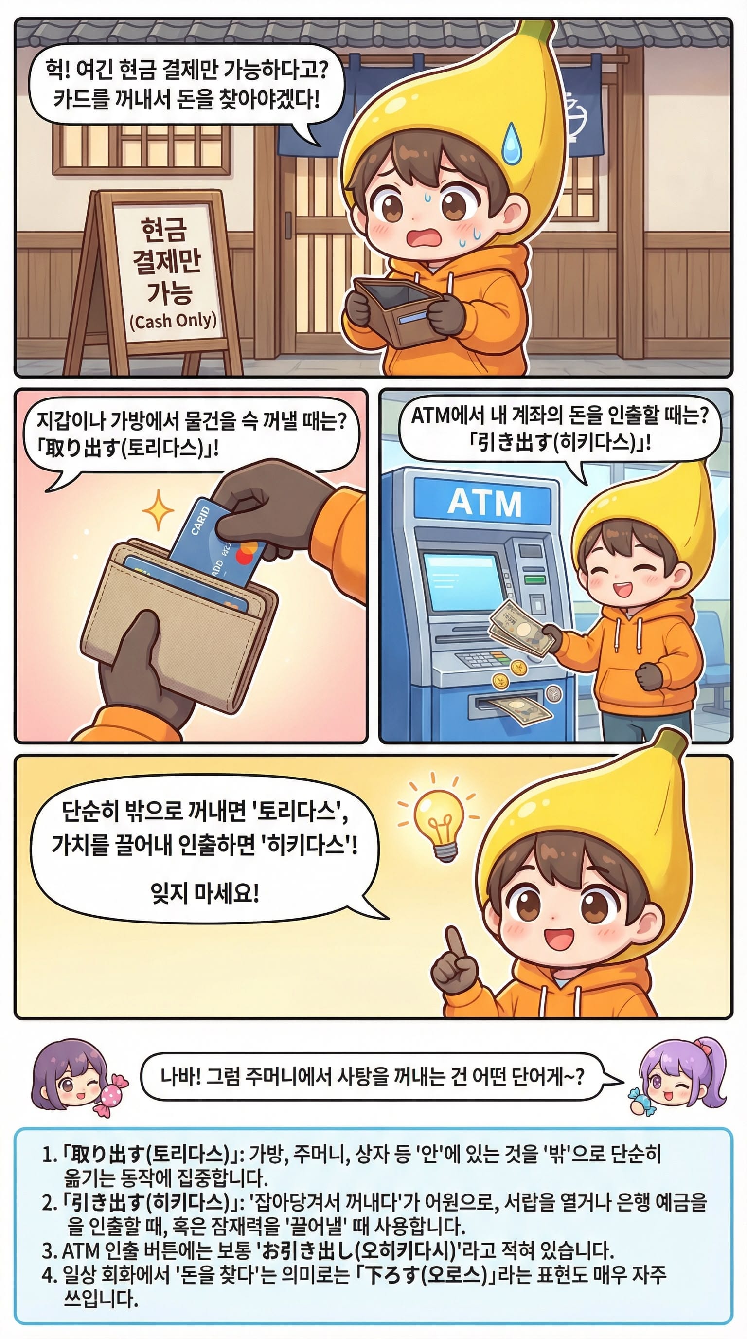 "비슷해 보이지만 쓰임새가 전혀 다른 일본어 동사 '取り出す'와 '引き出す'의 미묘한 뉘앙스 차이를 구체적인 예문과 함께 명쾌하게 해설합니다."