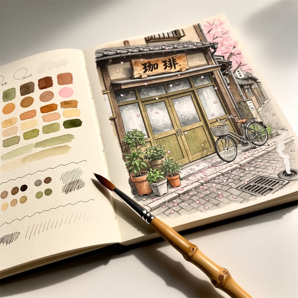 A watercolor and ink sketch in a Japanese accordion-fold sketchbook (orihon), viewed from a 45-degree angle above, drawn on textured off-white paper. The right page shows a detailed drawing of a vintage Showa-era kissaten (Japanese coffee house) with frosted glass doors, a faded signboard, and potted plants at the entrance reading '珈琲' (coffee), located on a quiet cobblestone back alley in Kyoto during cherry blossom season with pink petals falling. A vintage bicycle parked against the wall. , steam rising from a nearby drain Warm nostalgic travel journal aesthetic. The style is loose and observational, with visible ink outlines, transparent watercolor washes in muted earth tones. The left page shows color swatches and test strokes. A watercolor brush with a bamboo handle lying across the spread. Plain white table surface background. , highly detailed architectural rendering3. 개인의 스타일 발전과 학습