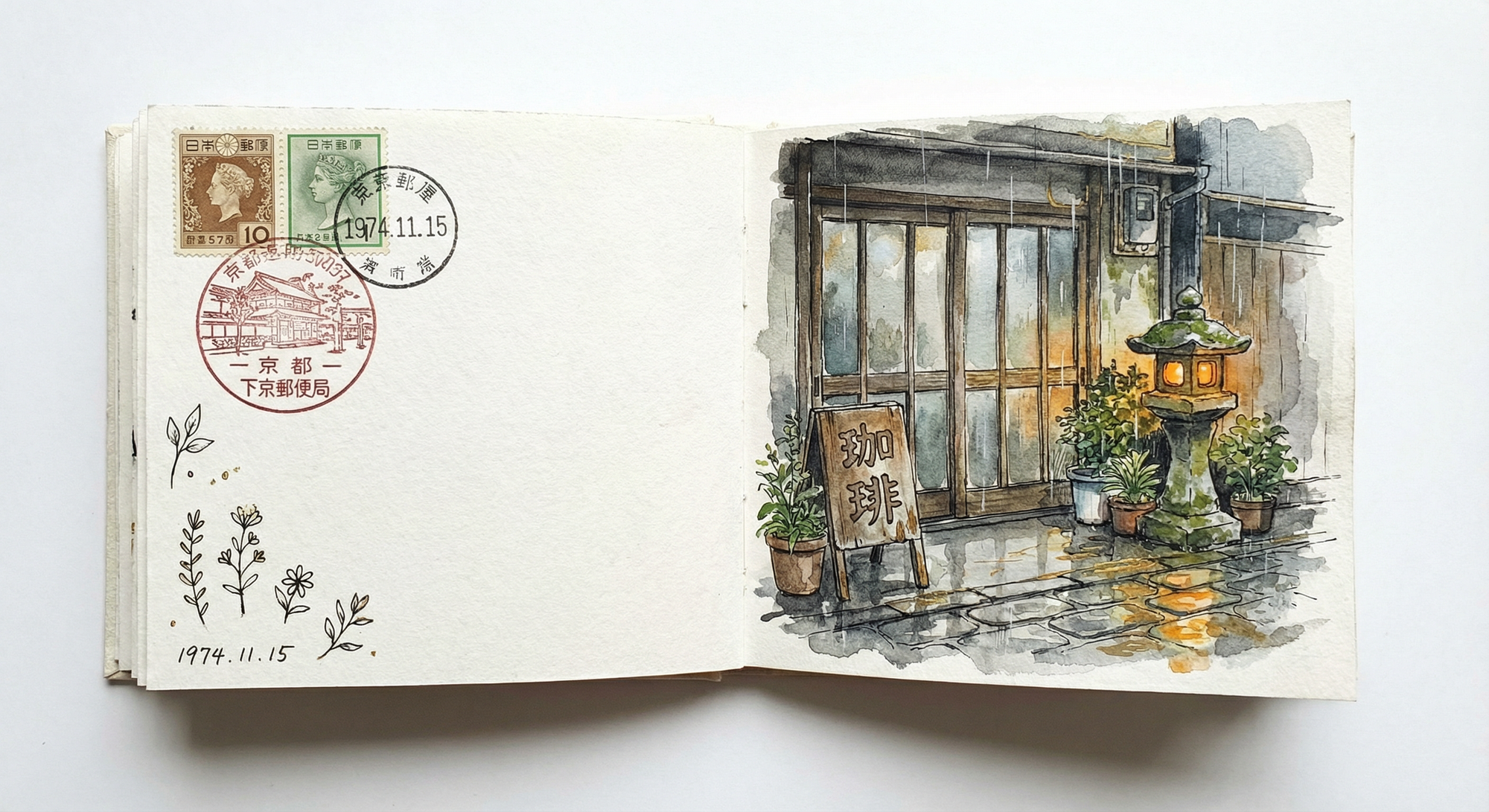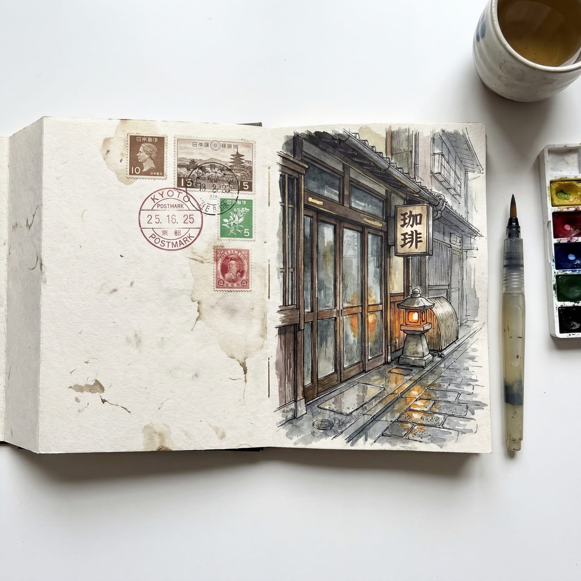 A high-resolution, masterfully composed flat-lay photograph of an open Japanese accordion-fold orihon sketchbook resting on a clean white surface. The sketchbook features heavy, cold-pressed textured off-white paper with visible organic ink bleeds and delicate watercolor granulation. On the right page, a detailed architectural sketch depicts a nostalgic Showa-era kissaten in a quiet Kyoto back alley during a rainy afternoon. The coffee house features weathered wooden framing, frosted glass doors, and a faded signboard with hand-painted "珈琲" calligraphy. The atmosphere is captured in muted earth tones and transparent Gansai Tambi watercolor washes. A traditional mossy stone lantern emits a soft, warm amber glow that reflects beautifully onto the shimmering, wet cobblestone pavement. The left page is artfully decorated with vintage Japanese postage stamps and a crisp, decorative Kyoto postmark. The style is a loose, observational travel journal aesthetic with precise fine-liner ink outlines, gold ink highlights, and professional architectural rendering. 8k resolution, masterpiece, traditional medium, highly detailed textures, cinematic soft lighting.Gemini-3-Pro (nano-banana-pro), 어반스케치를 만나다